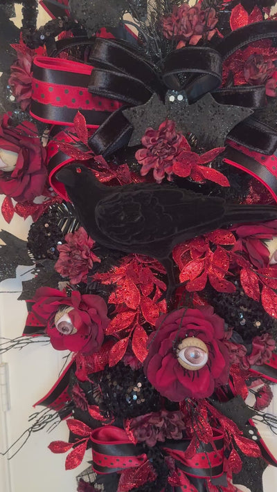 28" X 46" Blood red and black teardrop swag mesh wreath for Halloween. This is adorned with a large red-eyed black crow, multiple flying bats, black sequin ornaments, black sequin curly sprays, blood red roses with eyeball centers, multiple blood red matching flowers, and large matching bows in red and black. Not your typical Halloween wreath. Halloween wreath, mesh wreath, teardrop swag wreath, red wreath, black wreath, crow wreath, bat wreath.