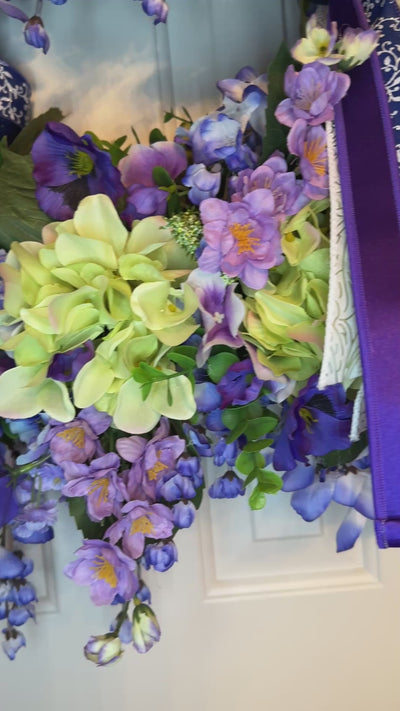 This is a beautiful moss base wreath with dark/purple Wisteria, light green hydrangea, lavender cherry blossoms, and purple pansies. Matching color coordinated bows in blue, purple, white, and green are adorned on either side. Great for everyday decor, Summer, Spring, or early Fall. It measures 24" X 24". Eucalyptus wreath, Wisteria wreath, blue wreath, floral wreath, Summer wreath, Spring wreath, Fall wreath, purple wreath, everyday wreath.