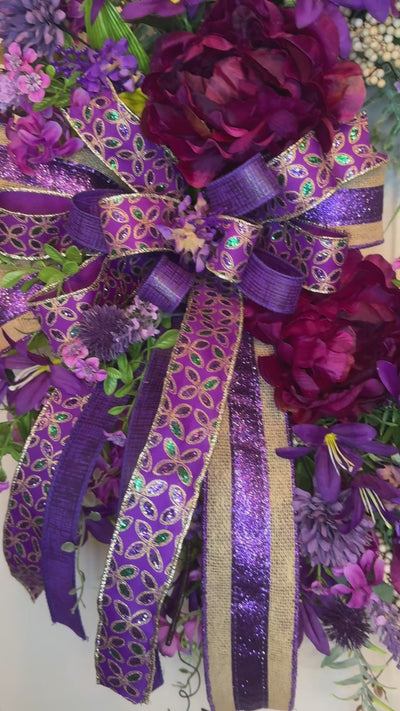 This is a beautiful dark purple/violet Peony oval grapevine wreath. It is adorned with flowers in assorted shades of purple and a beautifully matched glitter ribbon bow. It measures 32"X 20". A perfect addition for all purple lovers. Great for Summer, Spring, or early Fall. Grapevine wreath, purple wreath, Peony wreath, Spring wreath, Summer Wreath, Fall wreath, oval wreath.