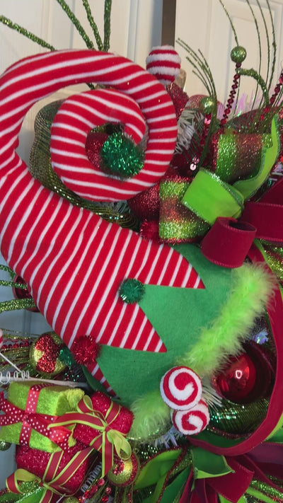 Christmas Elf themed wreath measuring 40" X 29" on a pine teardrop base with red and green metallic mesh. It is adorned with a red and white striped elf hat with lime green fuzzy trim and matching elf legs with lime green curly elf boots. Color coordinated bows in red and lime green ribbon are draped into the decor. Large peppermint candy pics, red and white swirl ball pics, red and lime green present pics, and lime green sprays help complete the look. Teardrop swag wreath, pine wreath, Christmas wreath, Elf wreath, red wreath, lime green wreath, ornament wreath, whimsical wreath.