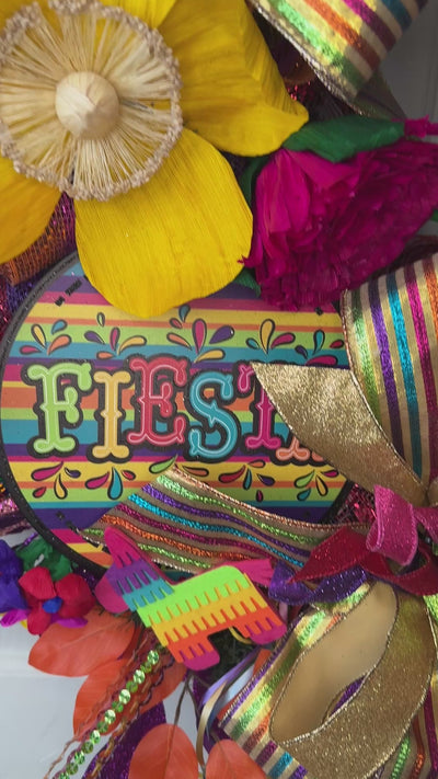 Gorgeous 30" X 40" (including ribbon) round pine base Fiesta wreath. This is a celebration of San Antonio with bright colorful attachments, including a pinata, a sombrero, corn-husk flowers, and multiple colorful pics and matching ribbon. Fiesta wreath, sombrero wreath, round wreath, pinata wreath, colorful wreath