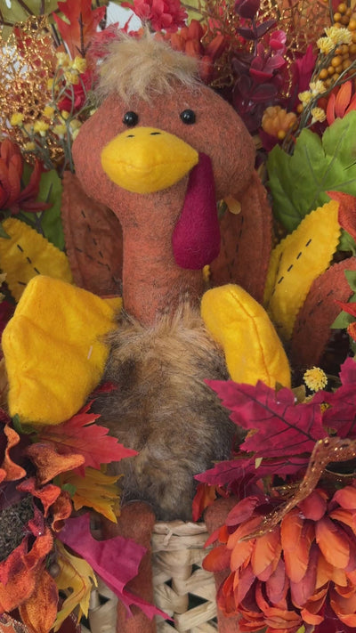 Great for Thanksgiving!! Hanging door basket in Fall colors measuring 25" X 25". It features a Cute "stuffed" turkey in Fall colors, rustic Fall leaves, rust Sunflowers and Chrysanthemums, seed ball sprays in orange, maroon, and black, filler bushes and filler flowers, and a beautiful color coordinated bow. Fall wreath, turkey wreath, hanging wreath, basket wreath, Sunflower wreath, Thanksgiving wreath