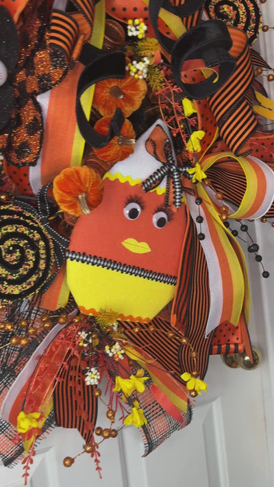 Stunning Candy Corn themed teardrop/swag mesh wreath. It measures 42"X 29 ". It is decorated with a whimsical Ms. Candy Corn attachment, a large candy corn spray, orange and yellow floral sprays, a large black and orange checked glitter ribbon flower with an eyeball, velvet pumpkins, black and orange glitter balls, and is topped off with a large draping bow in color coordinated yellow, orange and black. This is candy corn with an edge. Halloween wreath, candy corn wreath, yellow, orange, and black wreath, swag teardrop, mesh wreath.