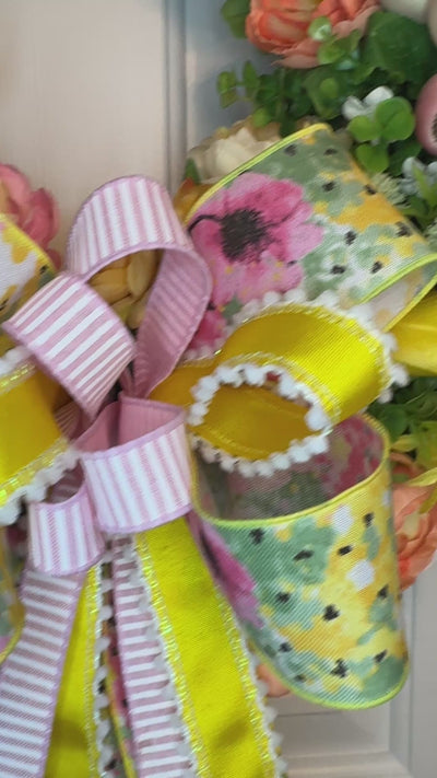 A touch of peach and Sunshine. This is a beautiful peach and yellow moss base eucalyptus wreath with flowers that include mini mums, Daisies, Peonies, Tulips in yellow and orange, seed pods, and a matching color coordinated bow. Great for everyday decor, Spring, Summer, Easter. It measures 22" X 22". Eucalyptus wreath, yellow wreath, peach wreath, floral wreath, Daisy wreath, Spring wreath, Peony wreath, everyday wreath.