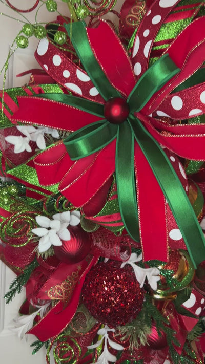 Large round pine base and mesh Christmas wreath measuring from top to bottom 39" and 29" from side to side. Adorned with a large central finial ornament in red, green, and gold, large red glitter ornaments, red and green glitter pics, Christmas bows in red, green, and white, and touches of white eucalyptus. Christmas wreath, red wreath, green wreath, polka dot wreath, glitter wreath, ornament wreath.