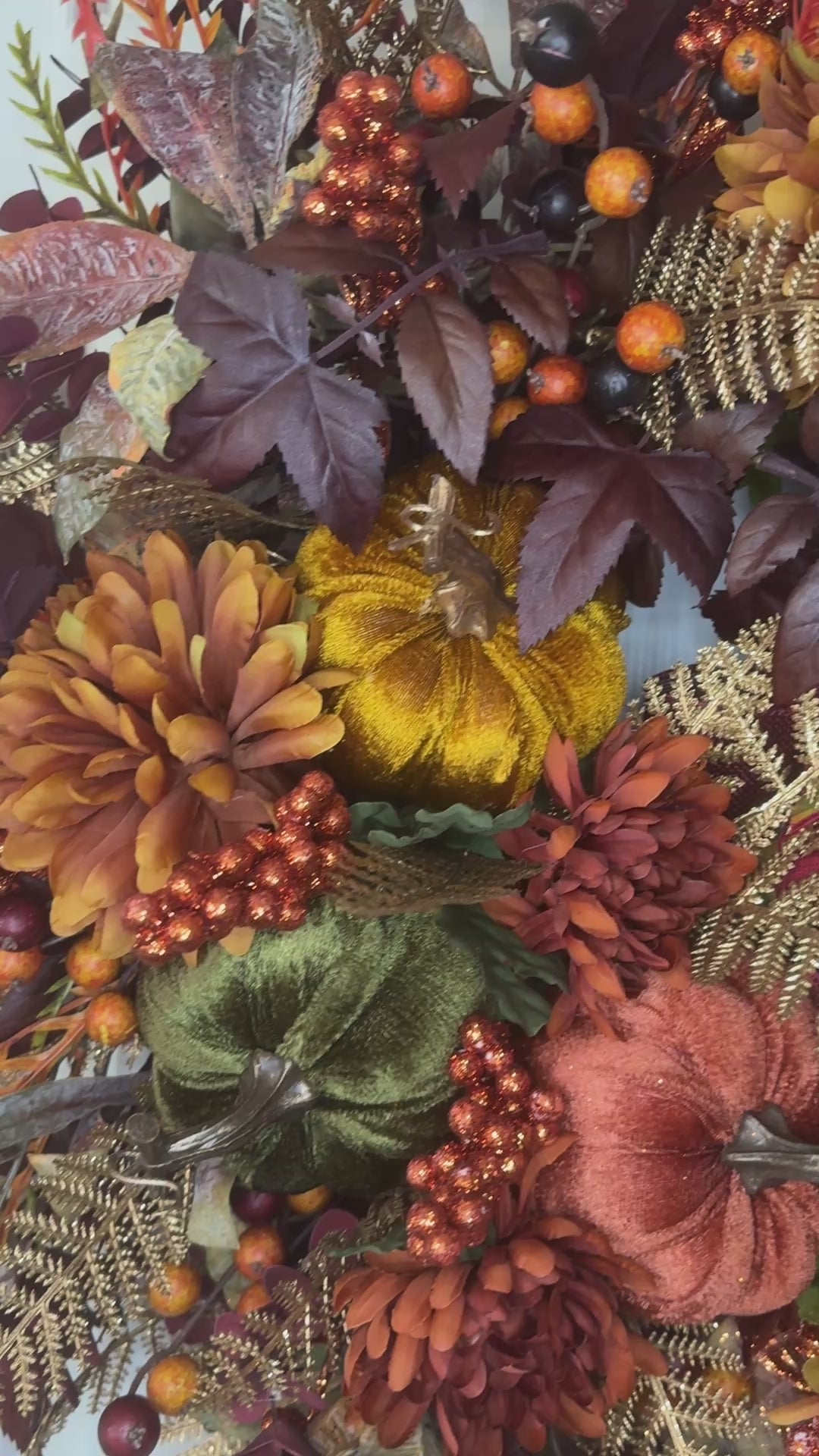 Fall-Thanksgiving round Grapevine Wreath measuring 31" X 31" in Fall rustic colors: burgundy, rust, dark green, orange, copper, and gold. It features beautiful Fall foliage with matching pumpkins, rust -colored mums, fall berry sprays, and color coordinated Fall ribbon. Fall wreath, pumpkin wreath, round wreath, fall leaves wreath, rust wreath, burgundy wreath.