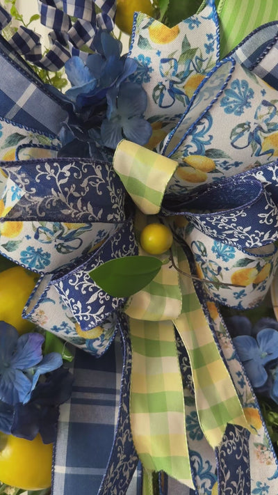 This is a beautiful 24" X 24" Lemon and blue Geranium wreath. It is on a moss base and is decorated with lemons, geraniums, an assortment of Spring leaves, white sprigs, blue and white plaid sprays, and a yellow butterfly. It has a matching Farmer's Market Lemonade sign and is topped off with a large bow in blue, yellow, and green. Blue wreath, Yellow wreath, floral wreath, lemon wreath, Geranium wreath