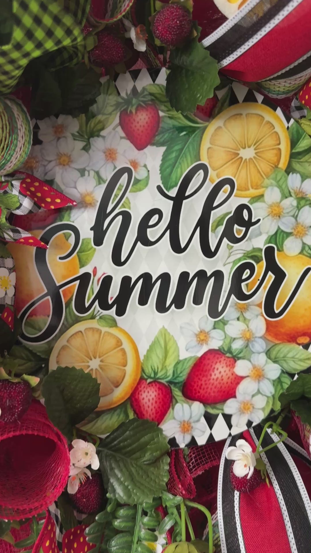 Beautiful 24" X 24" strawberry and lemon themed mesh wreath. It is on a wire and mesh base and is decorated with lemon slices, strawberries, and Spring fern leaves. It has a matching strawberry and lemon sign that reads " Hello Summer" and is topped off with a large bow in color coordinated red, black, green, and white. A great Summer wreath addition for any home. Strawberry wreath, lemon wreath, yellow wreath, fern wreath, mesh wreath.